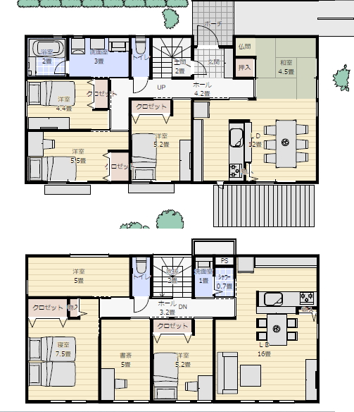 左側の2階は子世帯で、書斎1つと洋室2つと寝室1つ